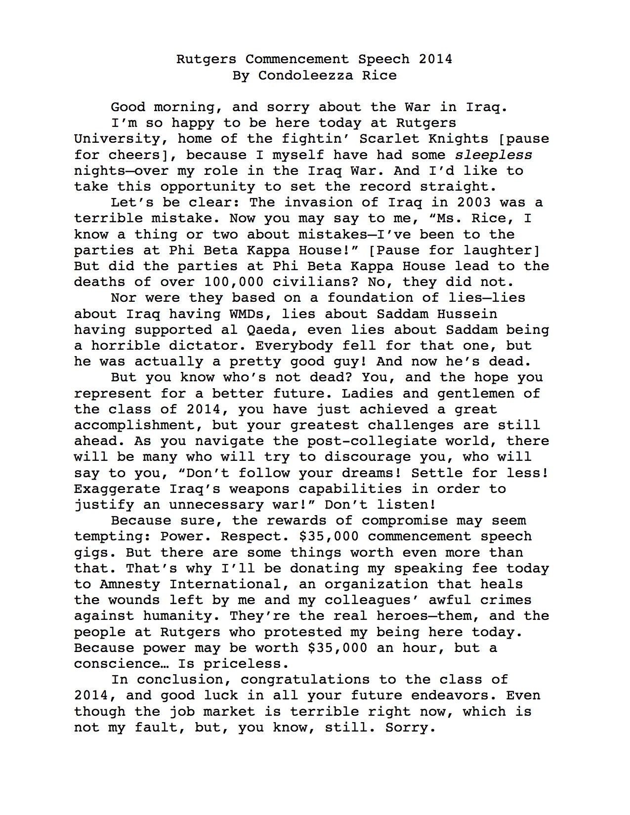 Former Secretary of State Condoleezza Rice made news recently by backing out of the commencement speech she was scheduled to deliver at Rutgers University after students and faculty members protested over her role in the Iraq War. But it turns out she won’t go entirely unheard, as it seems that someone got ahold of a copy of the speech she would have given had the event gone forward as planned. Check it out below: